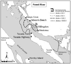 Seven Powell River sites were studied in July in 1993 and in 2004.
